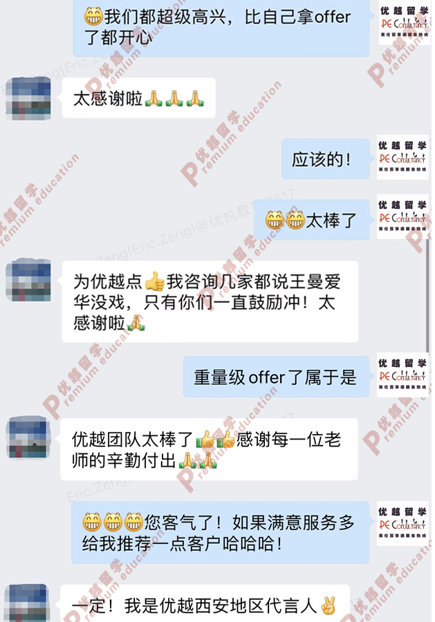 因為申請批次較晚,遲遲得不到學?;貞恢便枫凡话?。但又愿意相信以優越和自己的實力一定能拿到心儀的offer,終于在我拿到錄取的那一刻,心里的石頭才悄然放下。父母和優越的老師們也都替我感到開心,這是我們共同努力的結果。
