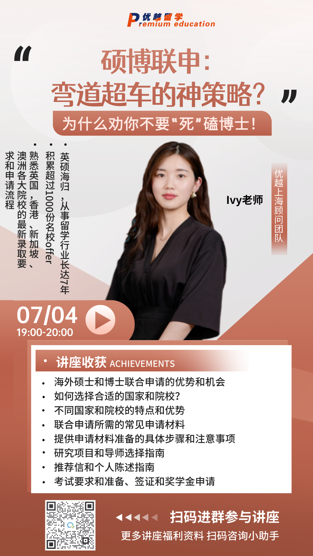 7月4日優越留學會舉辦一場“碩博聯申”專題線上講座,掃描圖片下方二維碼即可預約直播。如果錯過了也沒關系,加小助手微信可以查看直播回放,還有直播間干貨資料免費呈現!
