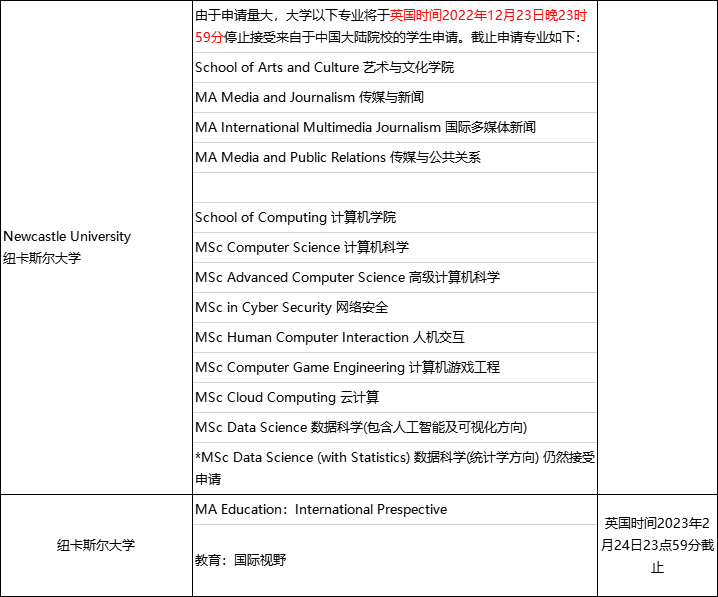 23fall的申請中,紐卡斯爾大學的部分傳媒類專業,計算機專業在2022年12月就停止申請了。而國際視野這個專業則到23年的2月份預計關閉。