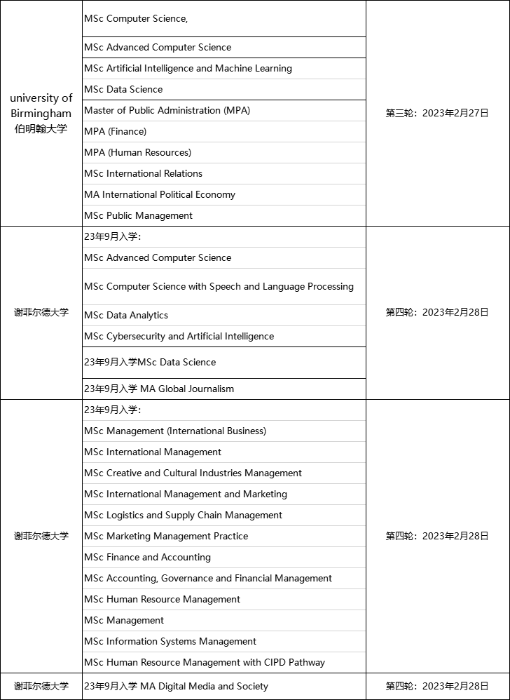 伯明翰大學和謝菲爾德大學,就明確了伯明翰大學的第三輪截止時間為2023年2月27日;謝菲的第四輪申請截止時間為2023年2月28日。