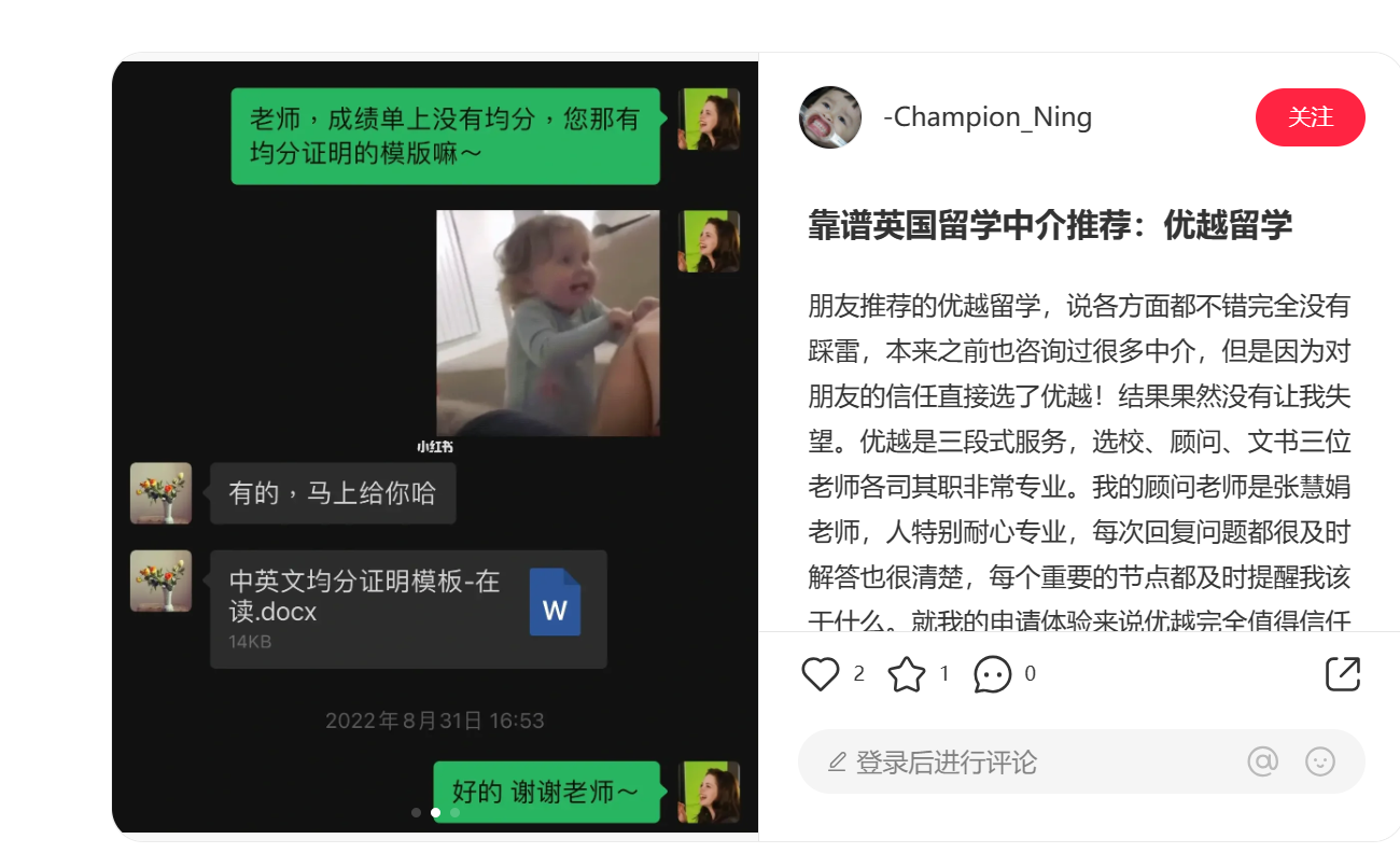 A同學:優越留學的服務非常耐心和細致。他們的咨詢顧問非常專業,對留學申請過程了如指掌,能夠給我準確的建議和指導。無論是關于選校、申請材料準備還是簽證辦理,咨詢顧問都能詳細的解答和指導這點讓我感到很安心。優越留學的老師們也非常專業和認真,他們在文書寫作方面有著豐富的經驗,幫我完成了非常高質量的個人陳述和推薦信。有時候在申請留學過程中會碰到很多問題,老師給我回復也非常及時,特別是在咨詢過程中還是在申請過程中,都能夠及時解答我的問題,真的可以說是值得信任一家留學中介。