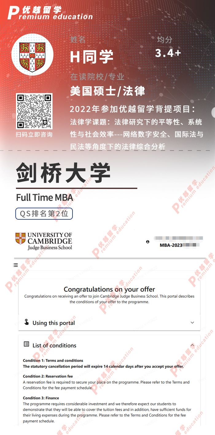 在優越留學的幫助下,該同學在申請過程中充分展現了自己在法律領域的專業知識和研究能力。通過優越留學為她精心準備的申請文書和個人陳述,她成功向劍橋大學的Full Time MBA項目提交了申請,并最終獲得了錄取通知。