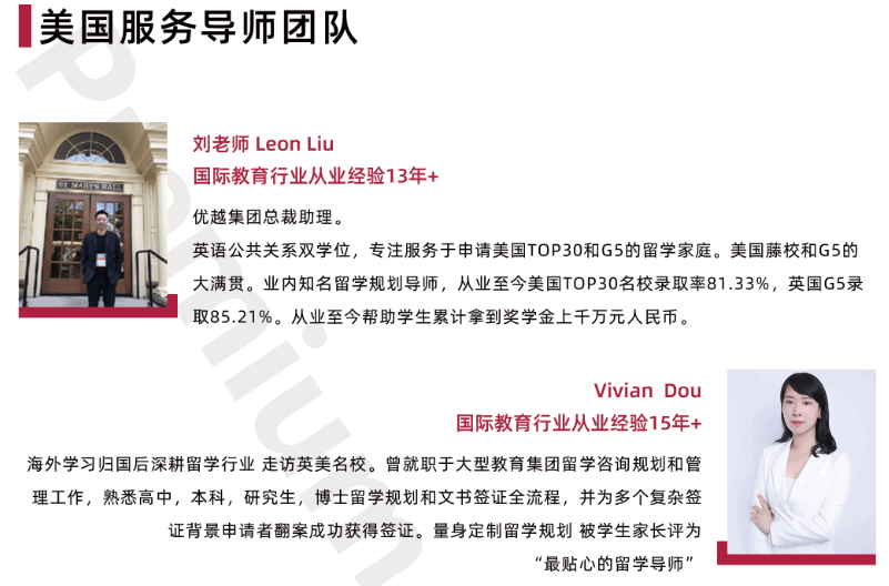 我們的專業顧問團隊很多,想要了解各地區顧問團隊構成可進入【優越顧問團隊】,想要了解顧問申請經驗可進入【優越顧問經驗分享】欄目查看更多!也可點擊【在線咨詢】,獲取更詳細的優越留學致美系列導師團隊介紹!