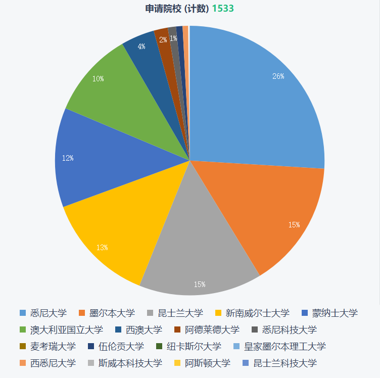 申請院校:以澳八大為申請主力,占比97%,申請人數最多的是悉尼大學,占比26%。,其次為墨爾本大學及昆士蘭大學,皆占比15%。