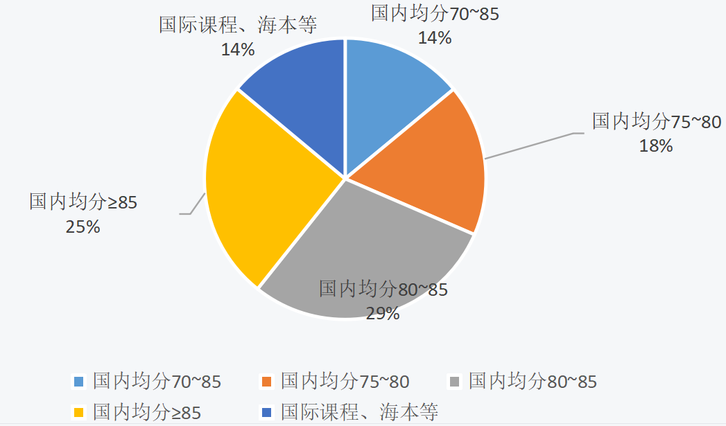 院校均分:國內均分集中在80~85區間的學生人數最多,此外,有就讀國際課程、國外海本的學生,占樣本數據的14%。