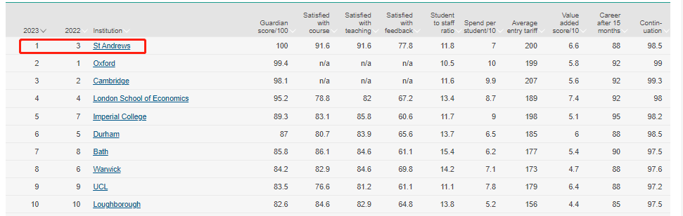 圣安德魯斯大學在2019年全國學生調查(NSS)中的學生學術經驗方面和滿意度排名第一。根據Guardian University Guide 2023顯示,St Andrews躍升英國第一位,高于劍橋大學,牛津大學。