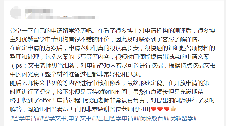 為了讓更多同學近距離感受優越留學的服務質量,我們整理了部分同學對優越留學的評價,形成了一份分享合集。