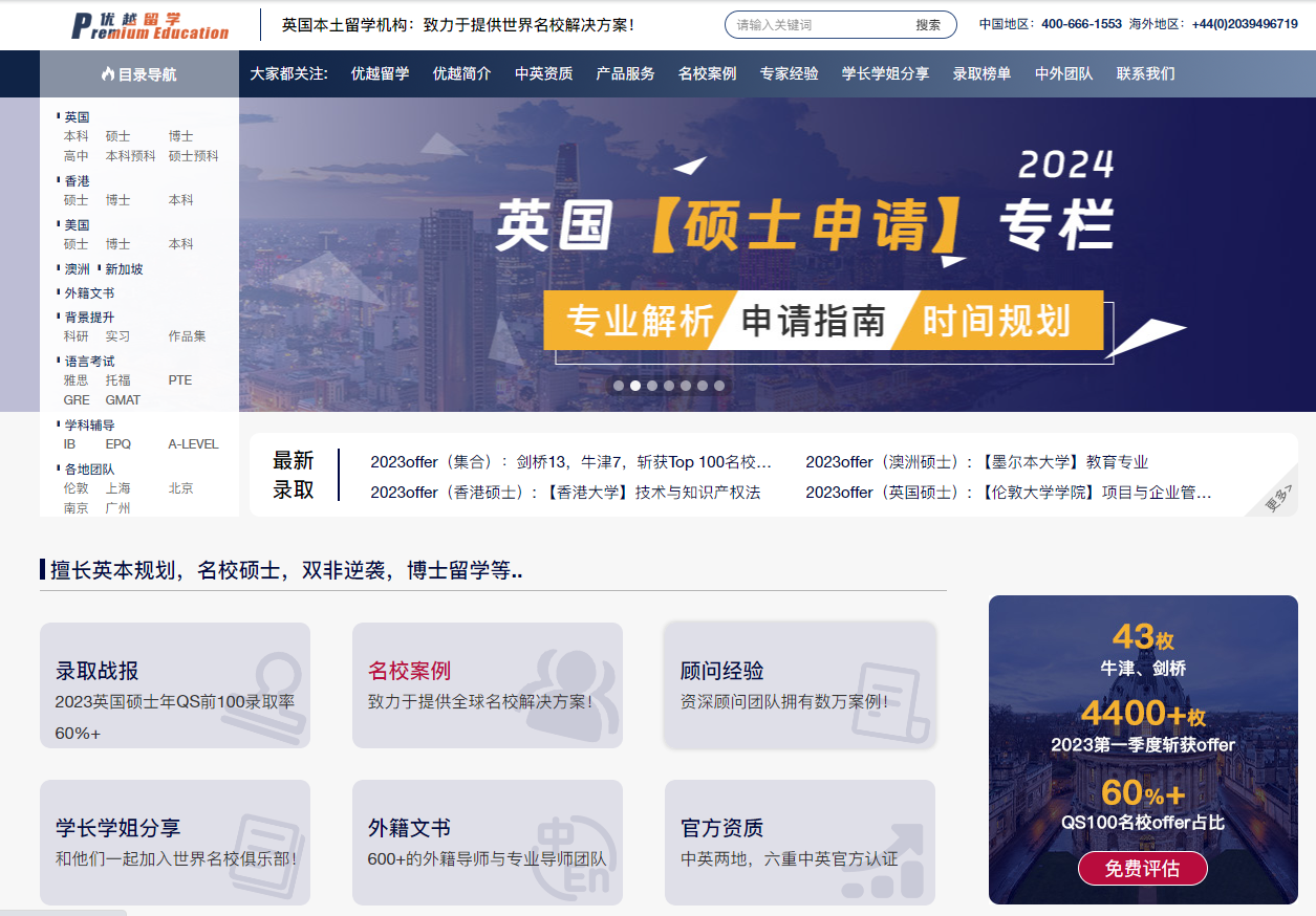 官網感受:優越留學的官網體驗很好,沒有滿屏彈窗,讓用戶感到舒適。重要的是,網站上展示了他們發布的申請干貨和許多當年的錄取榜單,作為英國本土的留學機構,也涉及了港澳新等地。