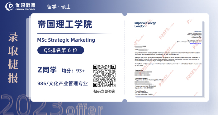 帝國理工學院雖然是世界頂級的理工科院校,商學院其實也是世界一等一的水平。作為帝國理工商學院的王牌專業之一,戰略營銷專業在2023年QS商科碩士排名中位列英國第一、世界第三,錄取要求只高不低。今天為大家分享的案例就是即將前往IC入讀戰略營銷碩士的Z同學,看看他是憑借怎樣的規劃方案順利錄取了這個千人競爭的項目。