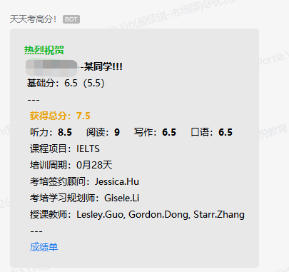 戰略營銷課程的雅思申請要求是總分7.0以上,單項不低于6.5。為了增加競爭力,Z同學還是希望在雅思成績上也能盡善盡美。在首考6.5(5.5)的基礎上,Z同學參加了優悅考培雅思提分班,經過28天的培訓,順利拿到了總分7.5的高分成績,閱讀和聽力甚至提到了8.5和9分!
