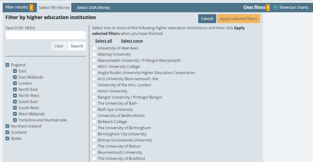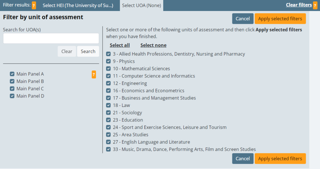 對于有意向申請英國大學博士的同學來說,如何在擇校過程中充分利用REF呢?在REF官網提供了兩種篩選方式: