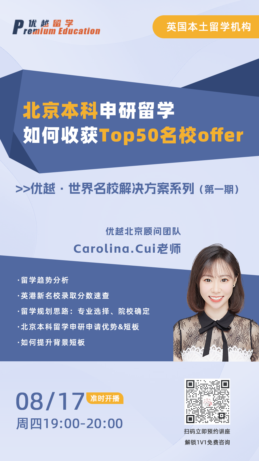 以上是【本期直播預告:北京本科學生如何收獲Top50名校offer ?優勢和短板詳細分析!】相關的全部內容,查看更多【直播預告】相關資訊可前往【優越留學】首頁!詳細申請規劃及方案定制請預約優越留學顧問為你一對一解答!