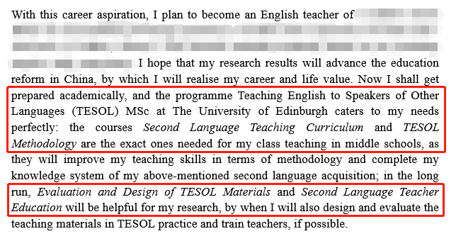 PS第一段用誠懇的語言描述了申請TESOL專業的興趣來源和職業理想,完美契合課程內容。