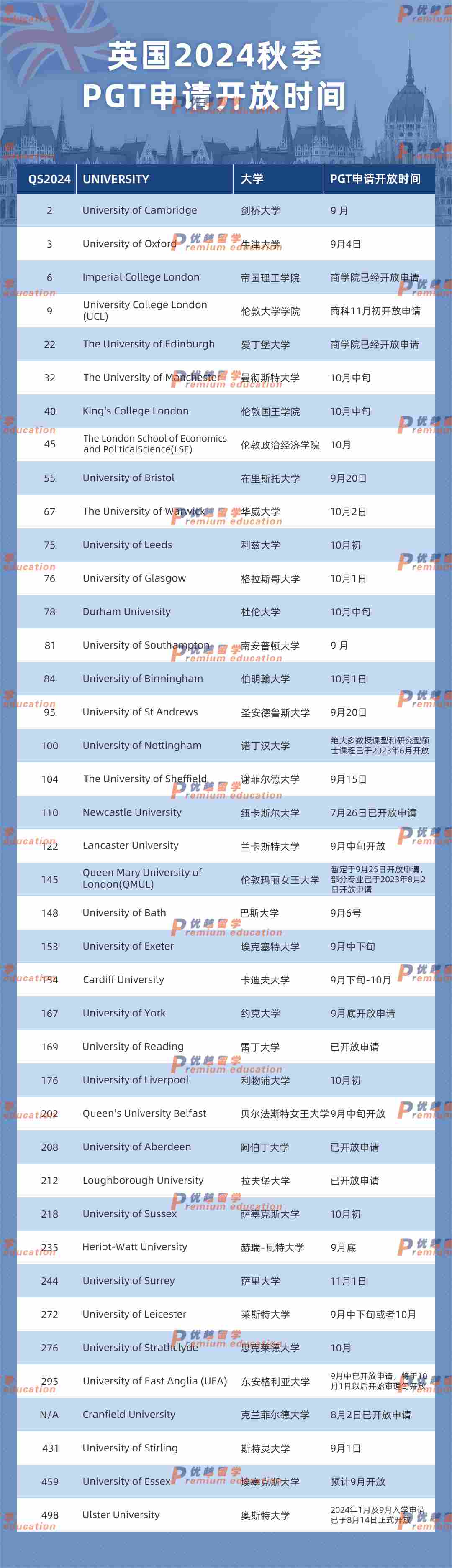 這里再給大家分享一下英國24fall各大學的授課型碩士項目申請開放時間表作為參考??