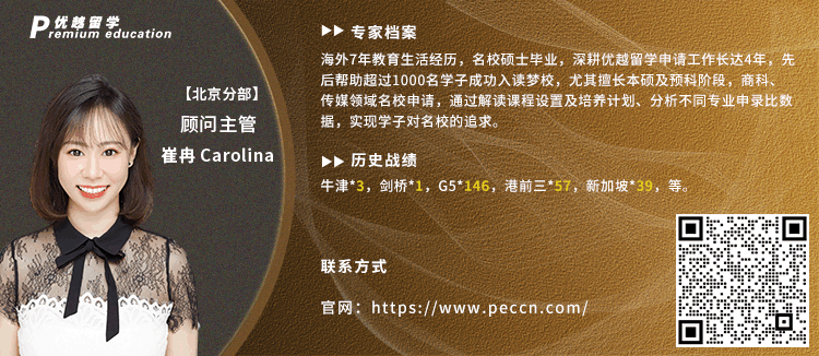 優越留學的資深顧問Carolina,擅長本碩階段的商科、傳媒領域的名校申請,通過解讀課程設置和培養計劃,分析報錄比數據,對學生的個人陳述進行個性化修改,幫助學生進入名校。
