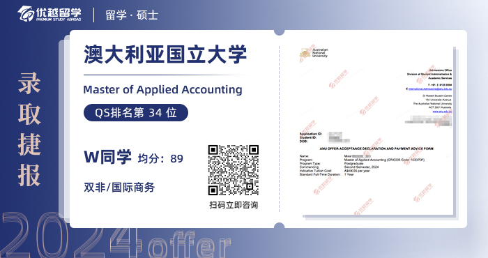W同學擁有審計專業的均分85+的優異學術成績,但由于背景較為特殊,他需要專業的指導來充分展示自己的優勢和潛力。優越留學的專業顧問為他提供了全面的留學規劃和申請策略。顧問們協助他精心準備了申請材料,確保所有文書和推薦信的質量和內容都能夠最大程度地突顯他的學術背景和潛力。此外,顧問們還為他提供了針對性的雅思考試準備,以確保他能夠達到ANU的語言要求
