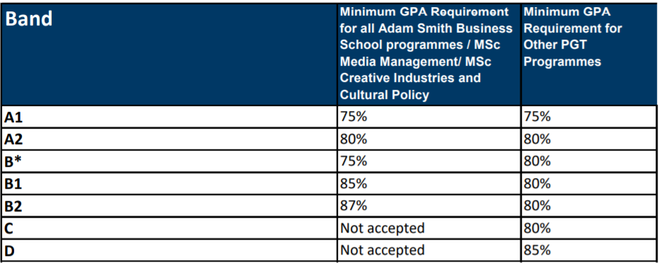 并且格拉斯哥大學將中國院校分為了7個不同的檔次(A1、A2、B1、B2、C、D、TNE),各有分數要求。具體如下圖所示: