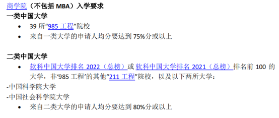 有認可的中國院校list,不同等級的院校背景均分要求不同。