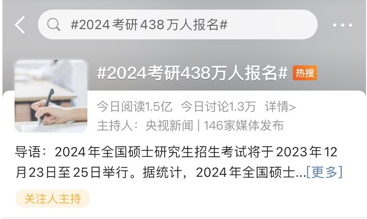前不久教育部公布了2024考研時間和報名人數,結果顯示約有438萬人報名了考研,數字雖然龐大,但卻比去年少了36萬,而且是9年來首次下跌。這對我們緊張備考的考研er來說屬實是一個好消息,競爭對手減少了,“上岸”的機會也就更大了。