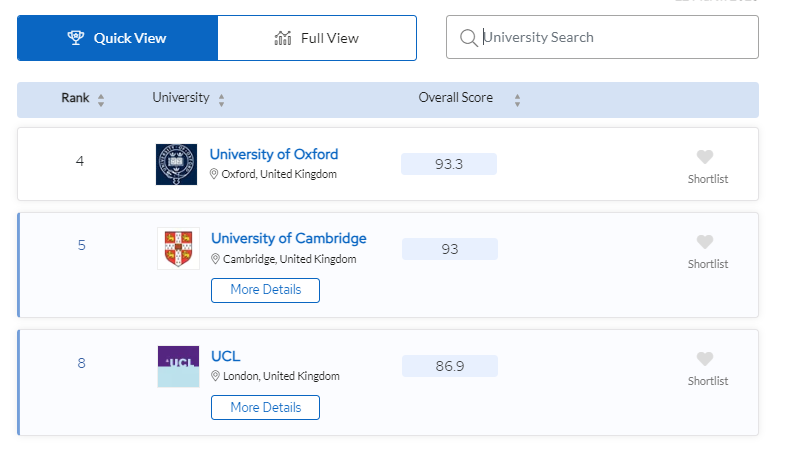 2023 QS學科排名中,生物醫學Biological Sciences專業位列全英Top 3的分別為牛津大學、劍橋大學以及UCL。