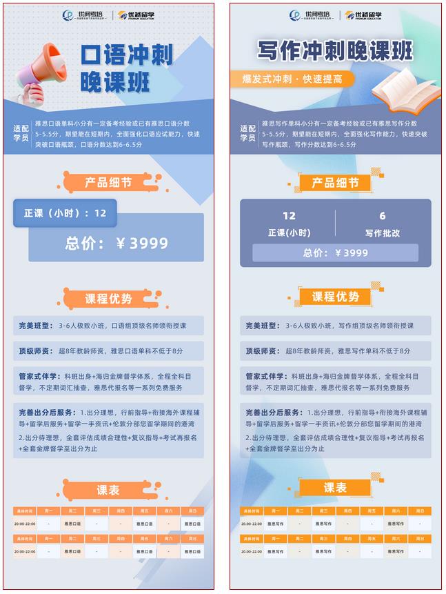 以上是【新課開班!口語沖刺晚課班+寫作沖刺晚課班,1月開課!】相關的全部內容,查看更多【出國留學雅思】相關資訊可前往【優越留學】首頁!詳細申請規劃及方案定制請預約優越留學顧問為你一對一解答!