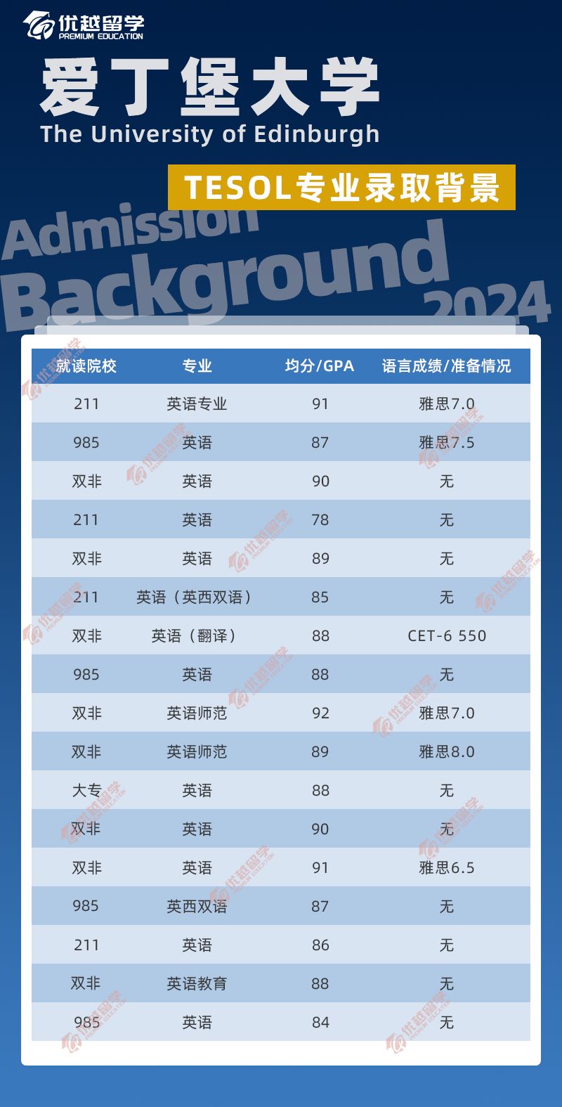 對于均分出眾的應屆生來說,愛大的TESOL性價比會更高。很多英國院校,例如曼大、布大,如果你申請它們的TESOL,是會對你的相關工作年限有要求的。相比之下,愛大只卡了一個學科背景,如果不在list內,均分足夠高,愛大也有可能給個機會,真的是很香了。