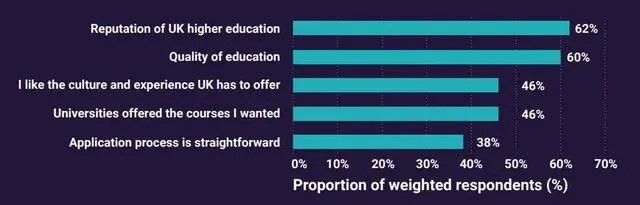 從UCAS報告看,10年來,中國留學生最看重的2個因素分別是高等教育的聲譽和教學質量。從數據變化趨勢看,英國文化體驗以及課程設置的影響占比在不斷上升。