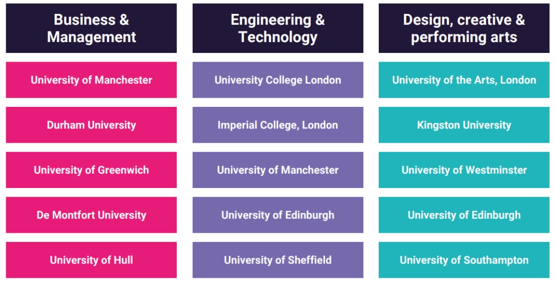 近兩年,中國學生已經開始理性內卷,在大熱專業選擇上,不會盲目沖刺。從官方數據來看,商業與管理;工程與技術;設計、創意與表演藝術類3大TOP方向的院校選擇排名如下: