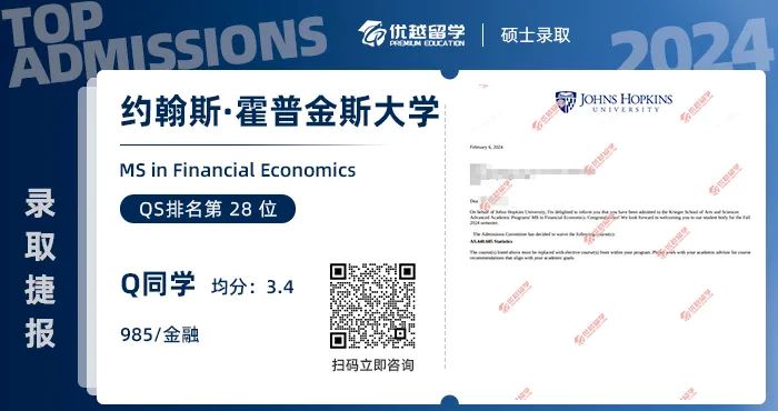 以上是【【美國top10】籌謀一年,金融學姐強勢拿下約翰斯·霍普金斯大學! 】相關的全部內容,查看更多【名校案例】相關資訊可前往【優越留學】首頁!詳細申請規劃及方案定制請預約優越留學顧問為你一對一解答!