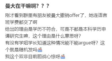 據目前的網絡輿論看,本次曼大撤銷offer,涉及到的大部分是雙非的同學,甚至有同學學費都交了,宿舍也選了,最終還是被撤了offer。