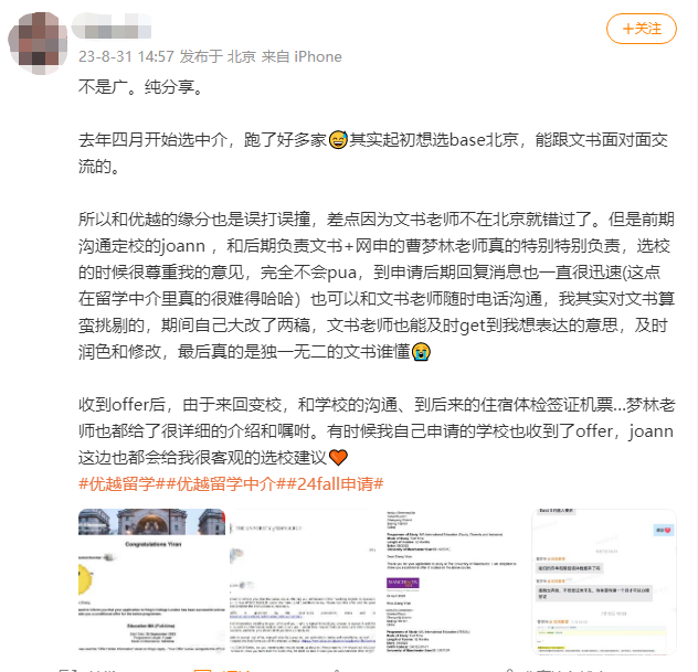 俗話說得好,選中介若不慎,申請季恐將悔恨。近期,北京的留學熱潮愈發高漲,眾多學子紛紛踏上了申請海外名校的征程。在這個關鍵時刻,選擇一家靠譜的北京留學中介顯得尤為重要。南京的小李同學就是一個成功案例,他通過精心挑選留學中介,成功獲得了多個心儀的offer。今天,我們就來分享一下小李同學在挑選留學中介時的成功經驗,并重點介紹一家備受好評的留學機構——優越留學。