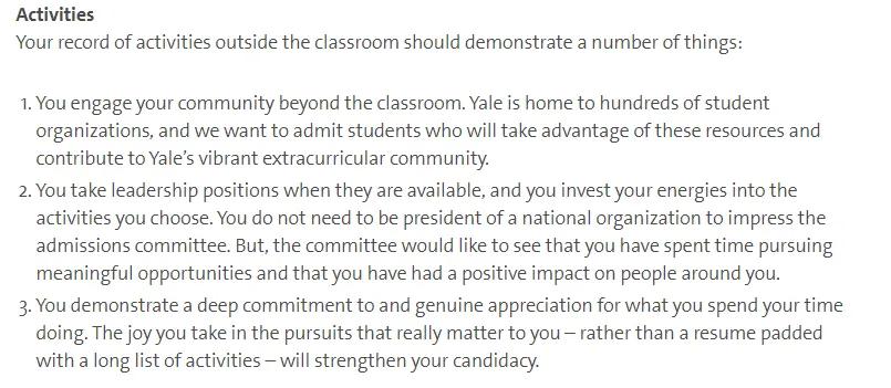 這是美國跟其他國家最不一樣的地方。了解過留學的人都知道,主流國家名校都挺看重軟實力的。但是,美國光有軟實力還不行,你還得讓院校體會到,這是你的興趣所在!耶魯大學就曾在官網言明:希望你們都是出于熱愛的目的進行的課外活動,對自己花時間做的事情表現出深深的投入和真誠的感激,而不是處于“申請”的緣故。