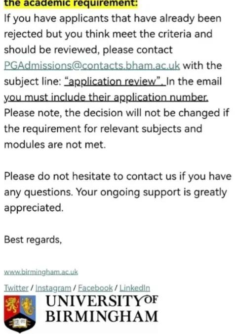 你以為這就結束了嗎?不!近日,不少早期被拒了的同學再次收到了伯明翰官方發來的郵件:如果你收到了我們發來的拒信,但認為自己符合錄取條件的,不要猶豫,快來找我們argue!