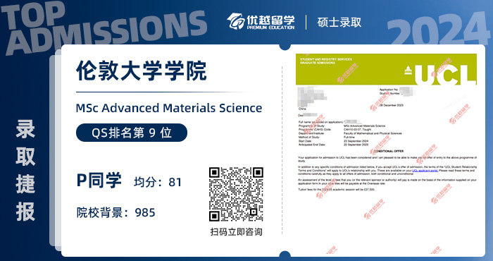 P學長是去年8月來到優越的,經過4個月的努力,憑借2段出色的科研項目表現,成功打破專業均分限制,英國碩士研究生上岸UCL先進材料科學碩士項目。接下來,就跟優越君一起看看,是什么樣的學生,能夠打動UCL,降分錄取吧~