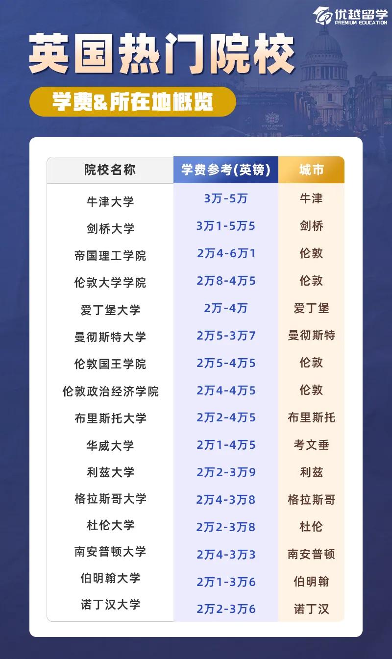 優越君將23-24年度英國地區熱門院校的學費區間做了一下羅列,25Fall的同學可以做一個參考。