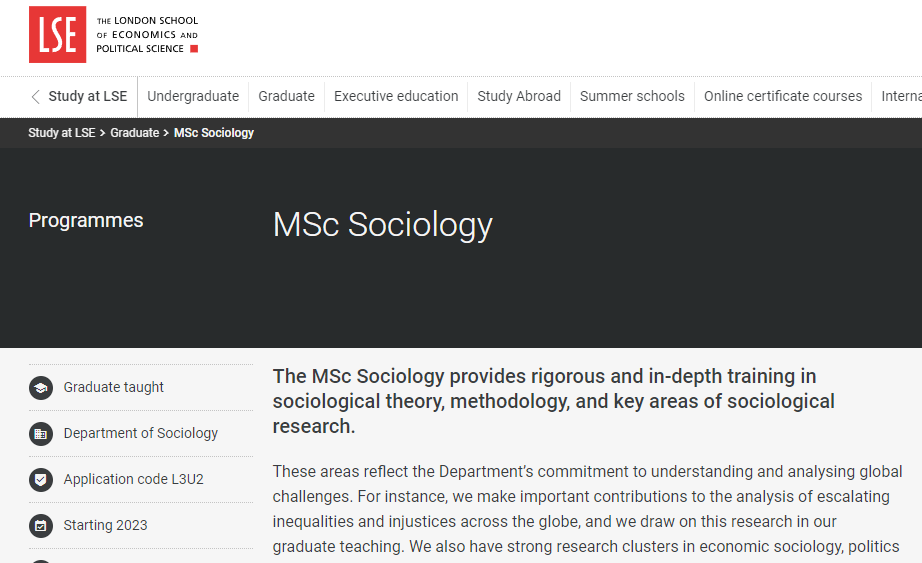 LSE的社會科學研究在世界排名前列,是我的夢校之一。這個項目的課程設置十分全面,有很多我想要探究的議題,例如消費、性別等,有許多課程還可以看出非常強的文化研究取向,我非常感興趣。還有一些家庭社會學主題的課程,我在本科階段缺少系統學習這方面理論的機會,所以這個項目完美契合我的研究興趣,而且能補充我不了解的理論。