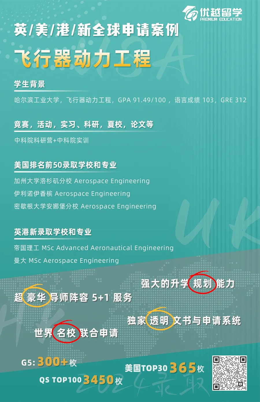 以上是【【碩士案例】航天航空領域學霸:均分90+,橫掃UCLA、IC英美頂尖院校offer! 】相關的全部內容,查看更多【offer榜單】、【名校案例】相關資訊可前往【優越留學】首頁!世界名校申請,找優越留學!選校定校、申請規劃、文書寫作、背景提升、方案定制一套搞定!點擊【在線咨詢】,優越留學顧問24h在線為您一對一解答!