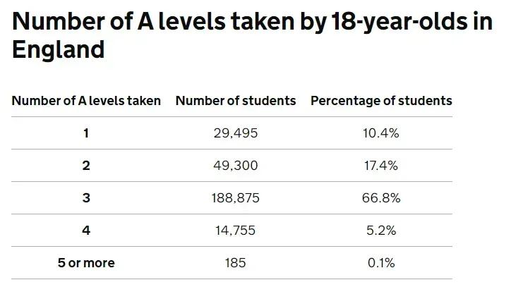 不講虛的,直接拿數據說話!根據最近A-Level數據,英國66.8%的學生選擇了3門,5.2%的學生選擇了4門。