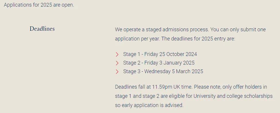 牛津和劍橋都屬于開放申請時間早、申請周期短的學校,牛津多數專業在開放次年1月就截止申請。此外,牛津部分專業申請步驟、附加材料要求繁多,優越君整理了一些需要額外注意的點,供想要申請牛津的同學參考。
