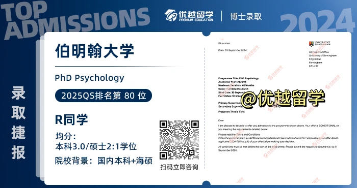 以上是【【博士案例】英碩無縫銜接博士,選定導師直申伯明翰大學心理學PhD!】相關的全部內容,查看更多【 博士留學申請】相關資訊可前往【優越留學】首頁!詳細申請規劃及方案定制請預約優越留學顧問為你一對一解答!