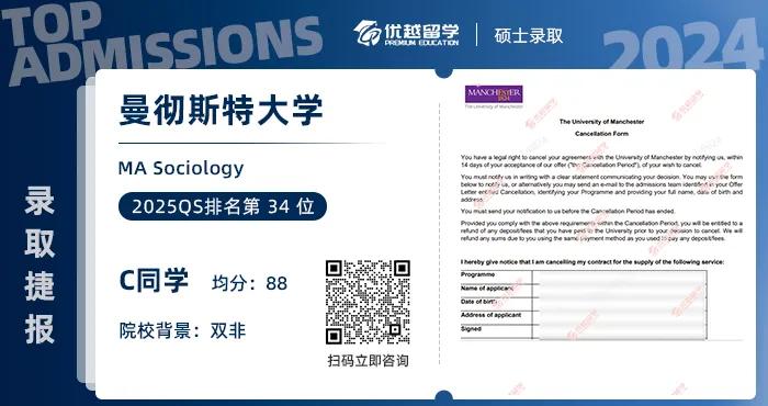 C學姐大三上學期就來到優越,通過提前規劃,在24Fall申請季里,雙非背景拿下曼徹斯特大學,同時還拿到愛大、華威、格拉斯哥大學的offer!