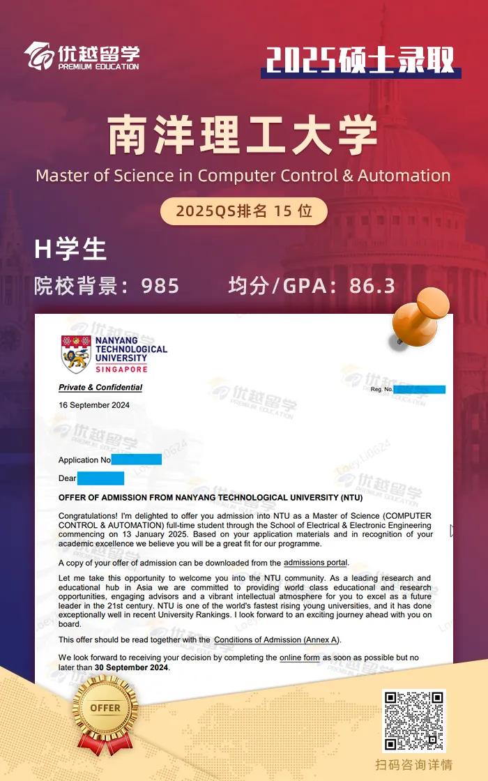 努力也是有收獲的,文書提交后僅15天,NUS就發來了offer,1月后,NTU南洋理工大學的offer也如期而至。至此,H學長成功圓夢!