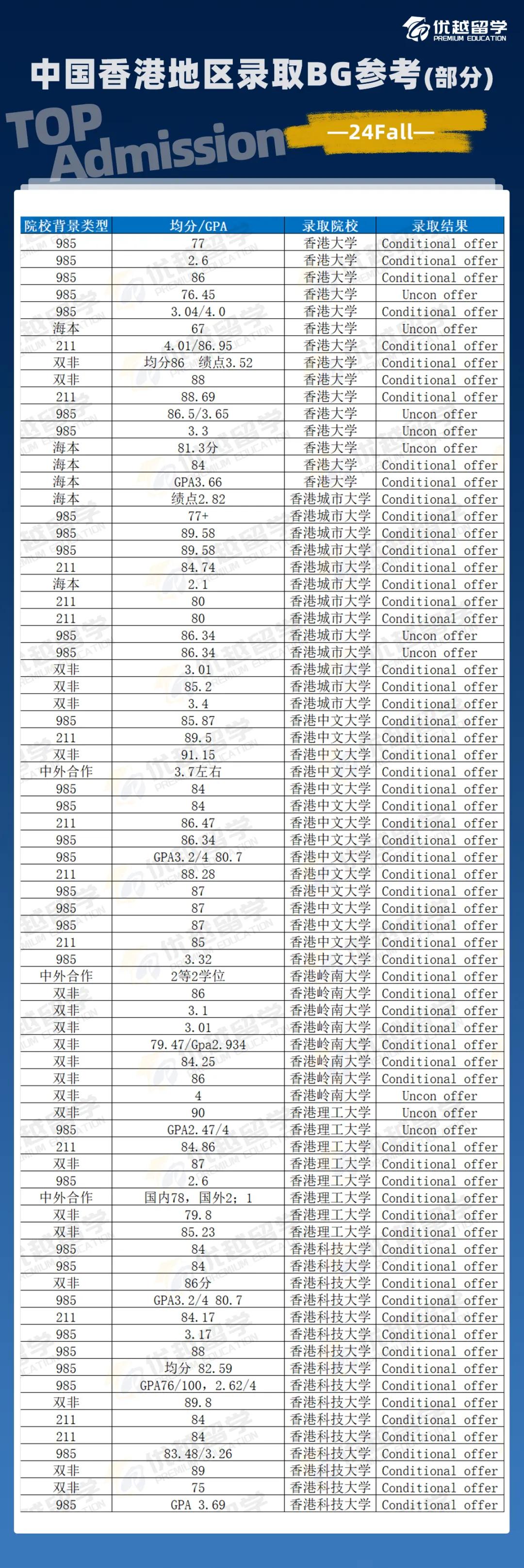 為了讓大家更好地了解港校的錄取偏好,優越君截取了部分24Fall的BG和錄取結果,以供大家參考?