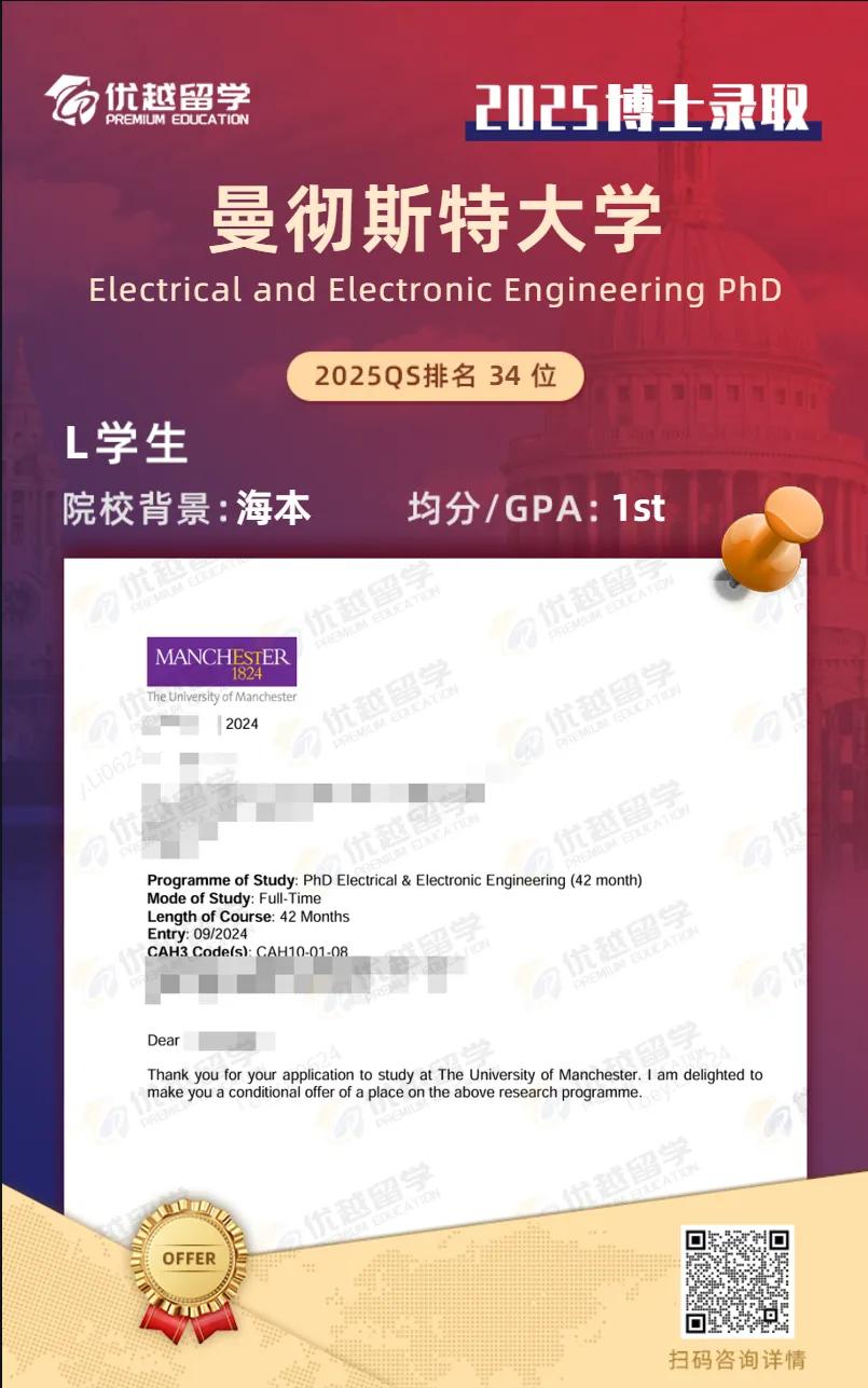 綜合規劃下來,我們幫他同時申請了研究型碩士和PhD,最終如愿拿下曼大心儀導師的EEE PhD offer!