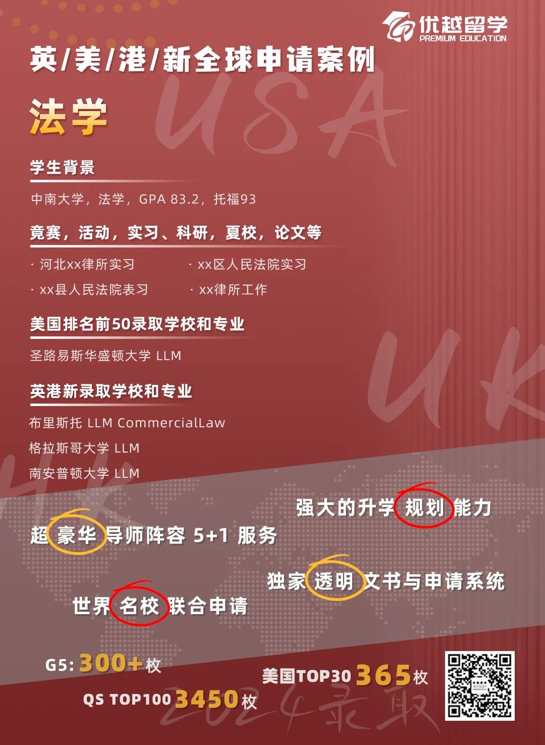 今天優越君給大家帶來的英美聯申案例詳解。H學長是雙非院校法學專業,在24Fall申請季里,選擇了優越留學的英美聯申,拿下了美國圣路易斯華盛頓大學、英國布里斯托、格拉斯哥、南安普頓大學的offer