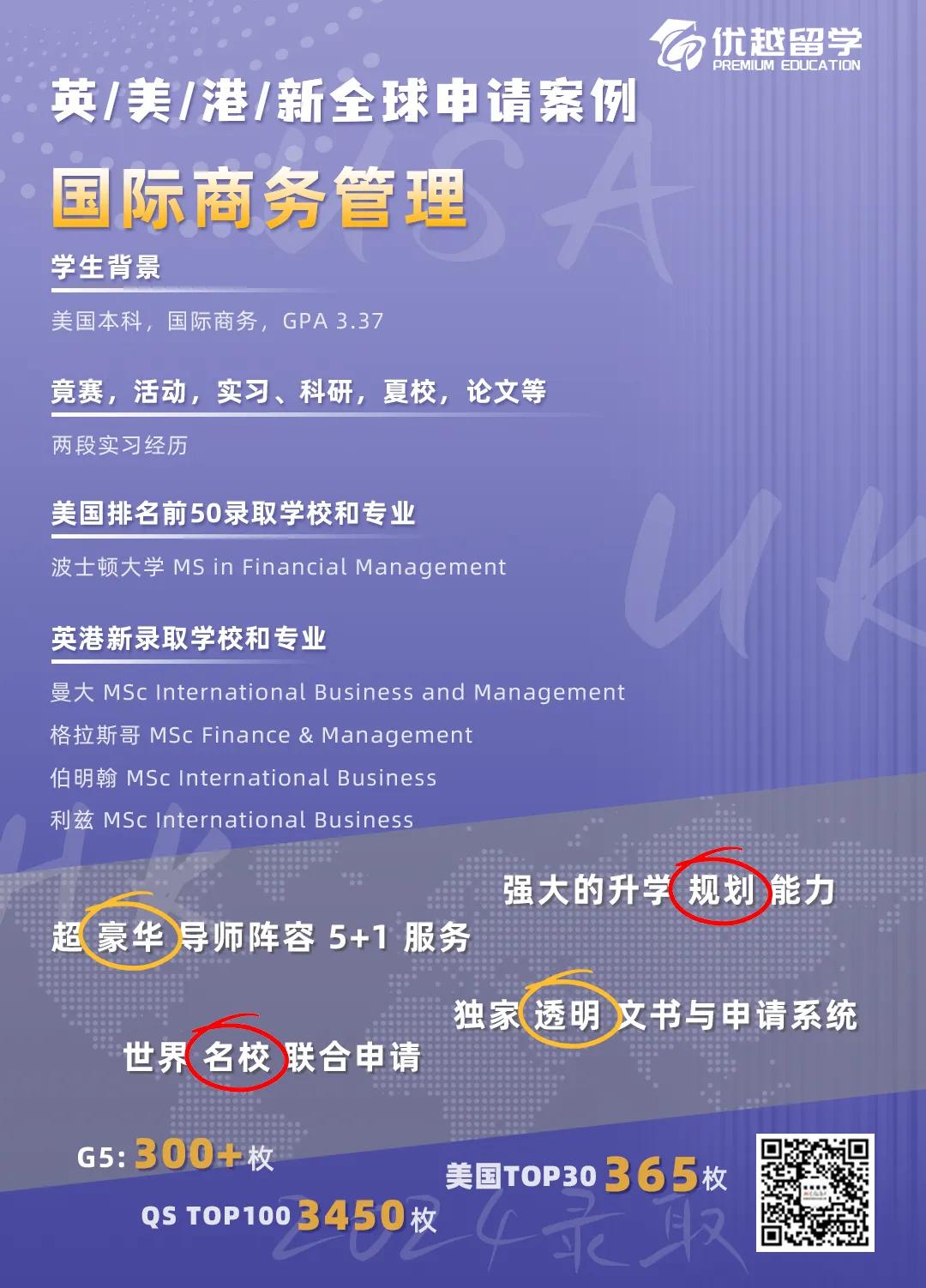 以上是【【碩士案例】美本開局聯申英美碩士,拿下波士頓大學、曼徹斯特大學offer! 】相關的全部內容,查看更多【offer榜單】、【名校案例】相關資訊可前往【優越留學】首頁!世界名校申請,找優越留學!選校定校、申請規劃、文書寫作、背景提升、方案定制一套搞定!點擊【在線咨詢】,優越留學顧問24h在線為您一對一解答!