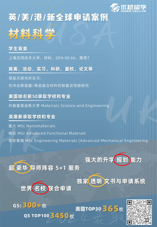 在申請英國曼徹斯特大學的 MSc Nanomaterials 專業時,我們結合曼大在納米材料領域的研究優勢,突出他在材料科學方面的基礎和潛力。我們提到他在本科學習中對材料科學的系統掌握,以及在實習和科研項目中積累的實踐經驗,這些都與曼大的納米材料專業的研究方向相契合。