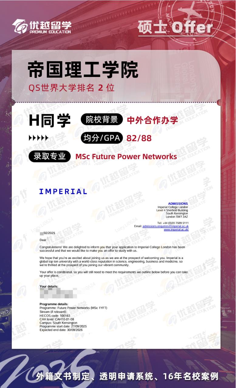 溝通策略上,我們定向狙擊招生官。發現 IC 該專業由電子電氣工程系與能源期貨實驗室合辦這一特殊性后,我們同步發送了補充材料。經過一系列精心的規劃與準備,申請結果令人欣喜。H同學成功拿到了 IC MSc Future Power Networks的offer!我們也祝H同學25Fall一切順利!