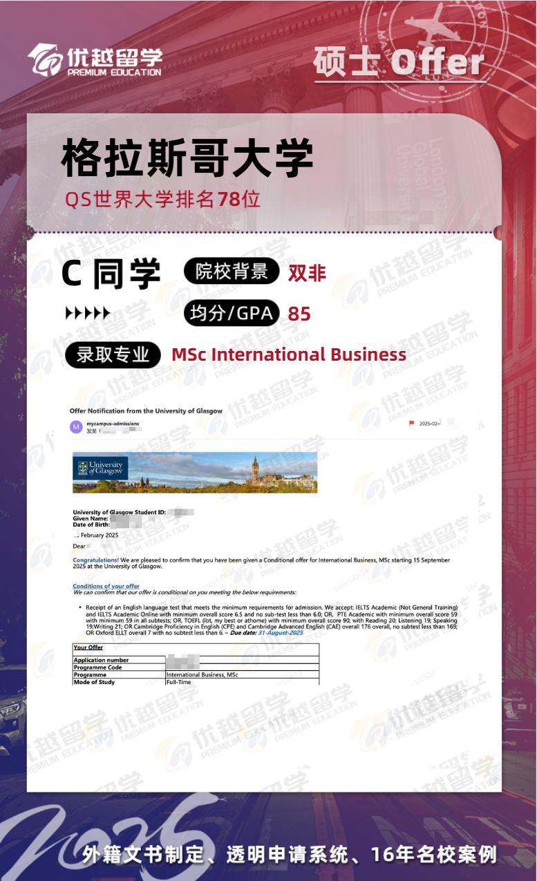 商學院史詩級放寬:取消對雙非院校的限制,均分直降 5 - 10 分!985/211 學生均分 75 +、雙非 80 + 即可沖擊商科專業。優越留學的文書團隊可以根據格拉斯哥大學商學院的新政策,突出學生的專業能力和潛力,讓雙非學生在申請中更具競爭力。