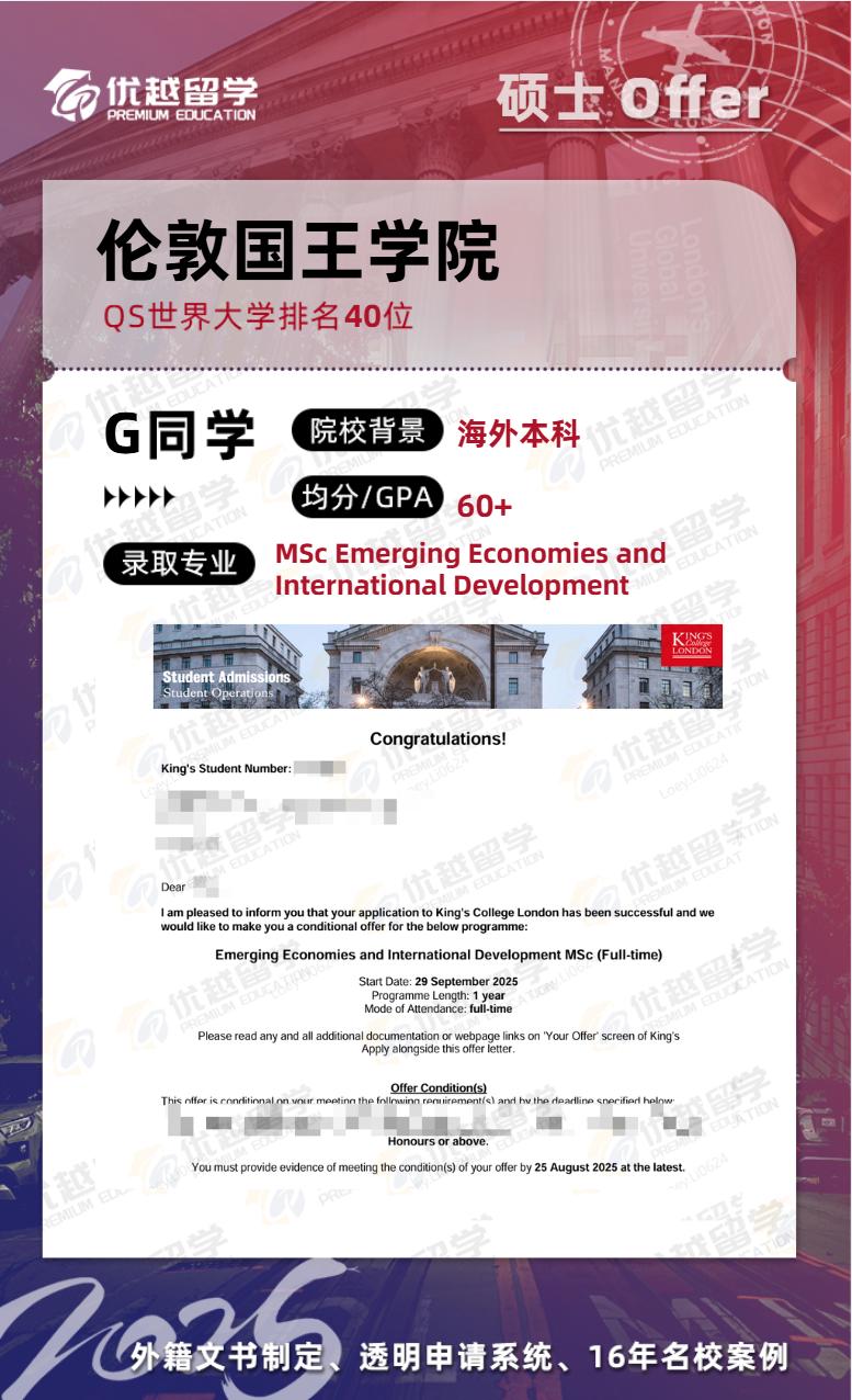 如果想申請 KCL,優越留學建議優先考慮剩余名額較多的社科類或交叉學科項目,比如公共政策、數字人文等。以公共政策專業為例,其課程設置融合了多學科知識,就業前景廣闊,且申請競爭相對較小。在準備申請材料時,優越留學的文書團隊能幫助同學們深度挖掘自身優勢,突出與專業的匹配度,大大提升申請成功率。像之前有位同學,本科專業與公共政策關聯不大,但在優越留學文書老師的指導下,通過闡述在相關實習和項目中的經歷與收獲,成功拿到了 KCL 公共政策專業的 offer。